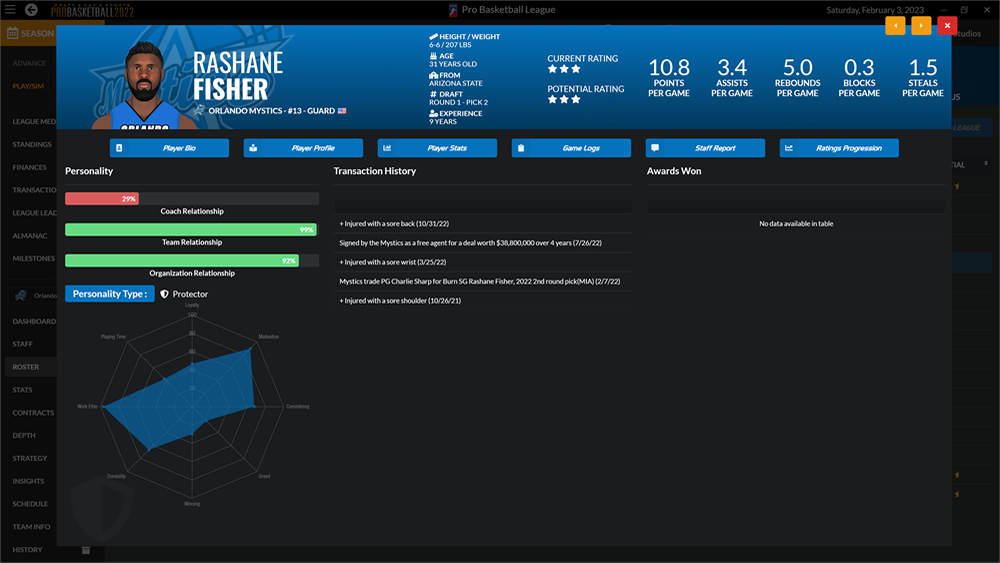 All new personality types allow each player, coach and general manager to have unique characteristics for you to manage and for them to interact with each other in the game. Each particular personality type has its own tendencies towards the game’s ratings in loyalty, motivation, consistency, greed, winning, work ethic and demands for playing time for each player to shape players in a certain relatable fashion.